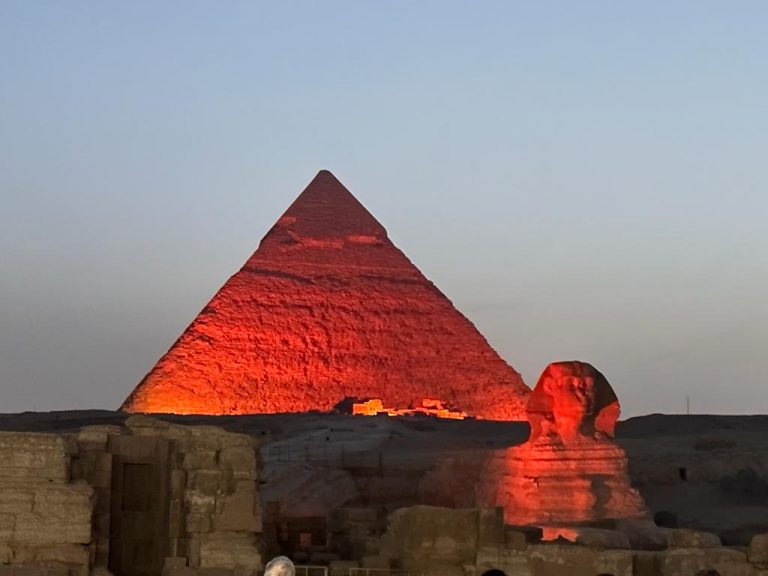 À noite, no espetáculo de luzes e história nas pirâmides, o deslumbre continuava enquanto tudo ficava colorido durante a narração que explicava muito do que precisamos saber sobre os faraós que as construíram, seus feitos e seus deuses prediletos.