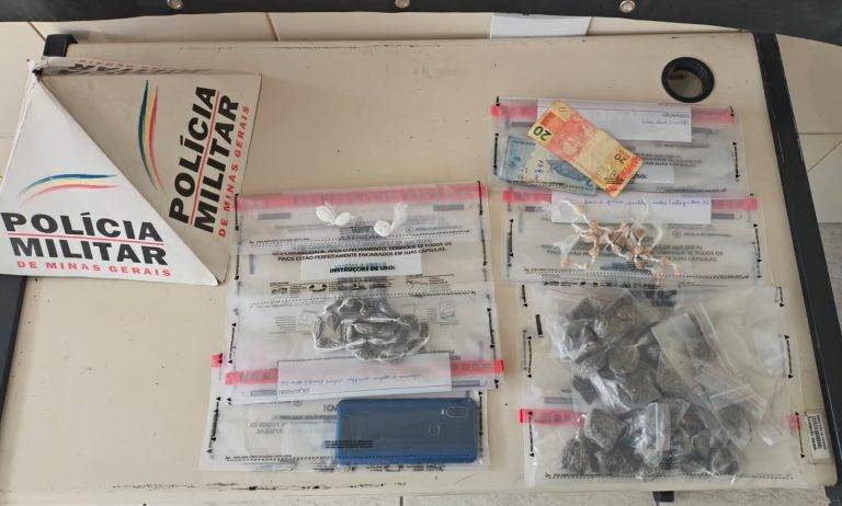 Com o indivíduo de 22 anos, havia 45 porções de maconha, três papelotes de cocaína, 24 pedras de crack e um celular. Com o adolescente, foram apreendidas 22 buchas de maconha e a quantia de R$ 30,00.
