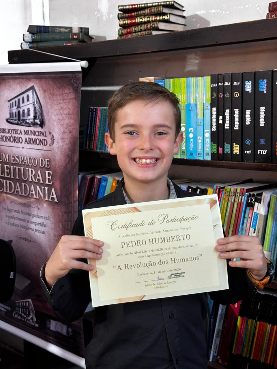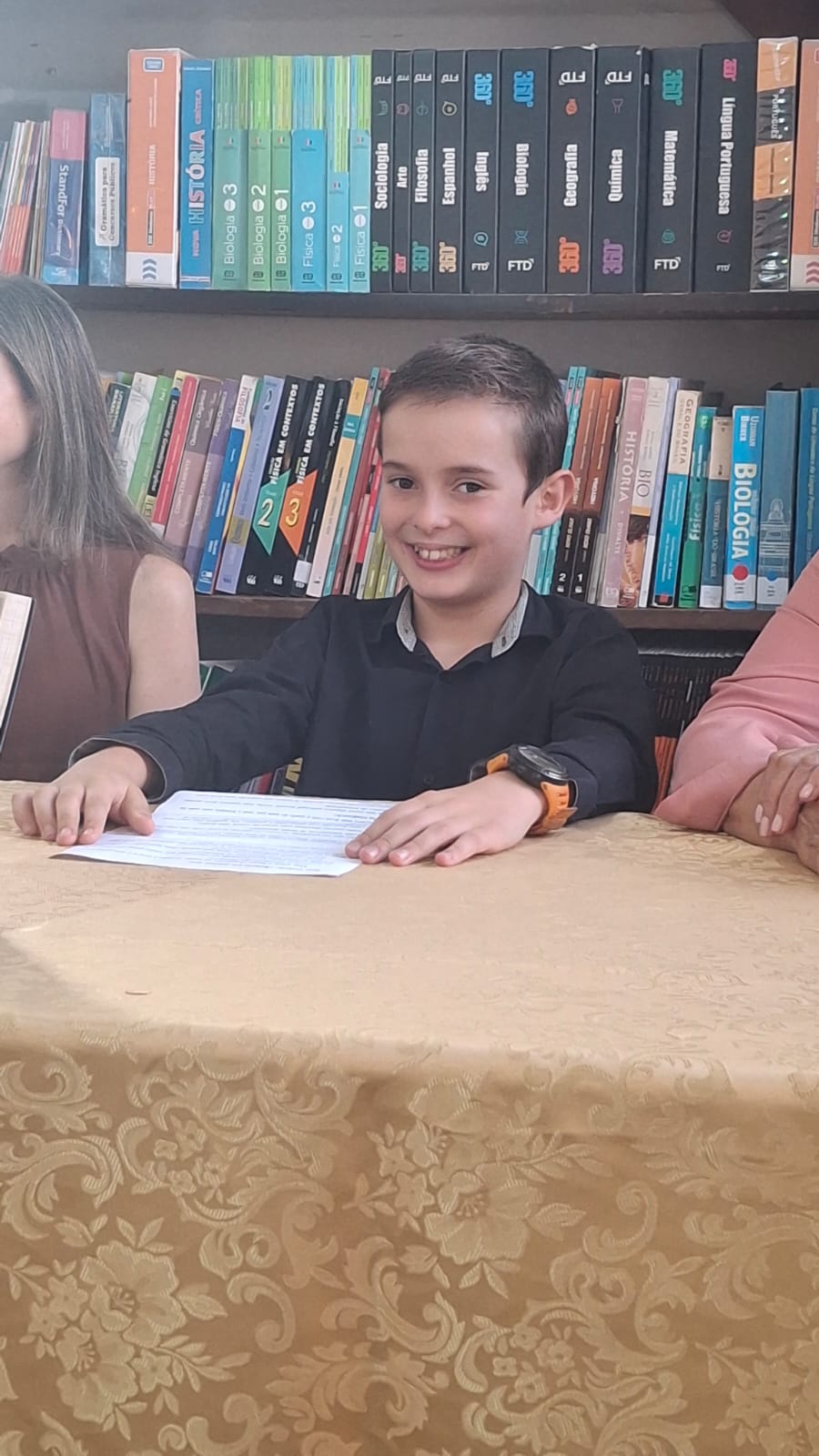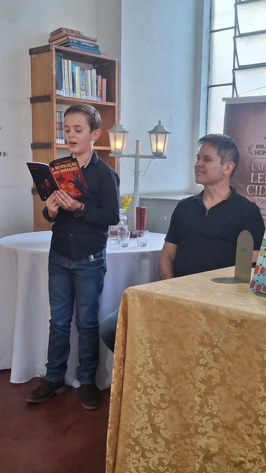 Um dos destaques da tarde foi a participação do jovem autor Pedro Humberto, de apenas 10 anos, aluno da quinta série da Escola Internacional Esperança. Filho do escritor Evandro Aléssio e de Carla Pedroso, Pedro encontrou nos livros do pai a inspiração para iniciar sua própria trajetória literária. Autor de “A Revolução dos Humanos”, seu primeiro livro, ele começou escrevendo as páginas à mão e, com o apoio do pai, passou a desenvolver a obra no computador, alternando entre ditar e digitar suas ideias. Com uma narrativa envolvente, o livro tem como principal objetivo divertir os leitores, ao mesmo tempo em que propõe uma reflexão sobre os possíveis impactos da tecnologia e dos robôs na evolução da humanidade — tema atual que despertou o interesse do público.