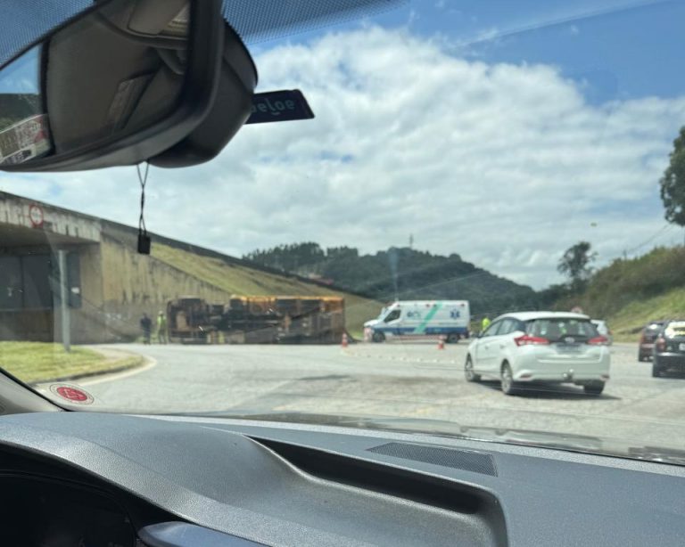 Um caminhão tombou no fim da manhã desta quinta-feira (05) na entrada do túnel sob a BR 040, perto do Barbacena Shopping. Segundo informações apuradas,