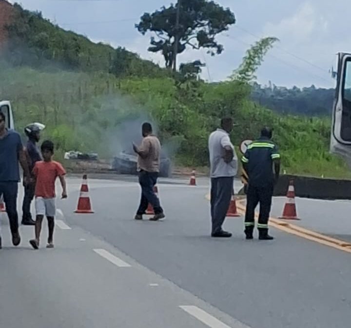 Um carro pegou fogo no início da tarde desta quarta-feira (18) no km 756 da BR 040, em Ewbank da Câmara. Dentro do veículo estavam