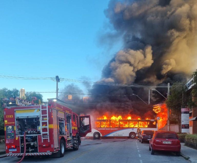 Um ônibus do transporte público de Barbacena foi consumido pelo fogo na tarde desta segunda-feira (22) no cruzamento da rua Dr Jaime do Rego Macedo