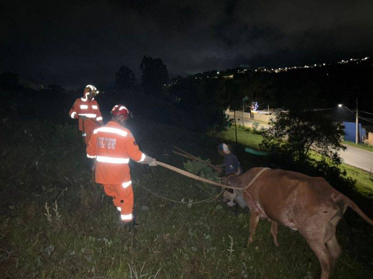 Na noite de segunda-feira (24), o Corpo de Bombeiros resgatou uma vaca em um local de difícil acesso no bairro Santa Luzia, em Barbacena. O