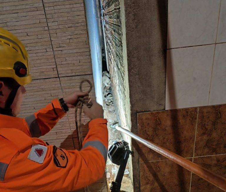 Na noite de terça-feira (25), o Corpo de Bombeiros resgatou um cachorro em situação de risco em Alfredo Vasconcelos. O animal estava preso no vão